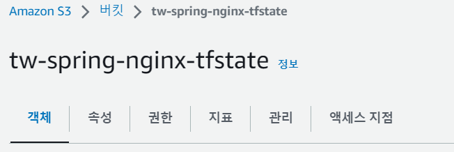 backend "s3" { bucket = "tw-spring-nginx-tfstate" key = "terraform.tfstate" region = "ap-northeast-2" }설정이 있어서 성공한다면 state파일을 s3에 저장해줍니다.